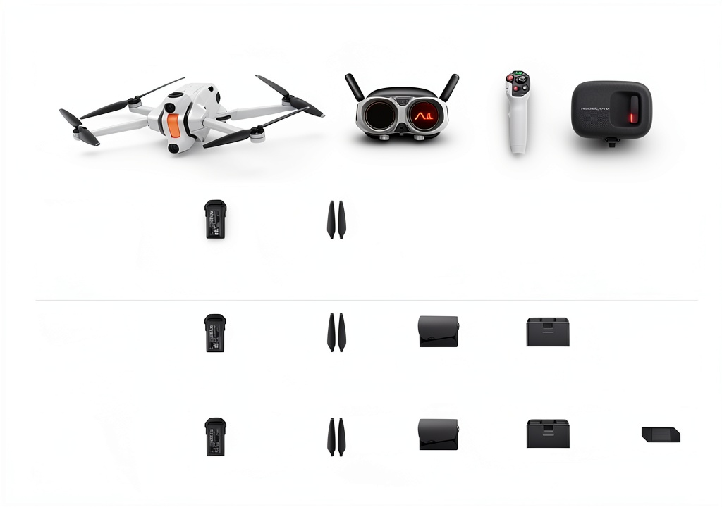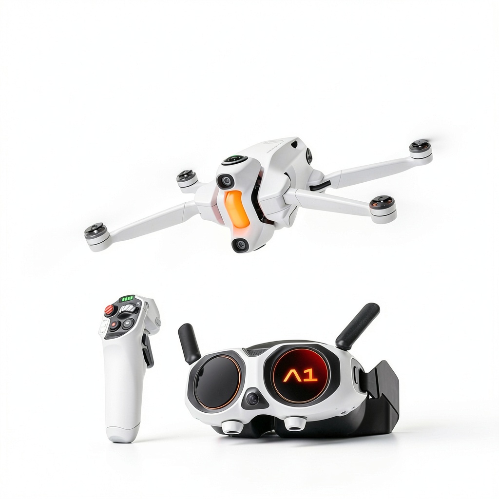 The bundle includes the A1 drone, Vision goggles, Grip motion controller, flight battery, lens caps, spare propellers, and a carry case.