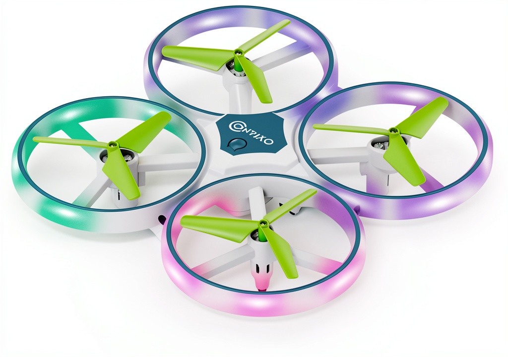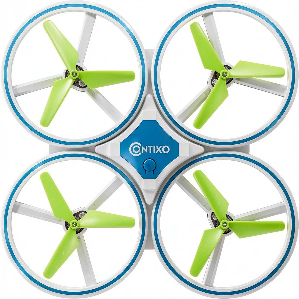 The Contixo Mini Drone is a compact, feature-rich flying device designed for beginners and kids. It boasts a durable build with dimensions of 6.7 x 6.7 x 1.6 inches, making it highly portable. Core features include 360-degree rotations and flips, speed switches for stunts, and LED strips for nighttime visibility. Powered by two rechargeable batteries, it offers up to 16 minutes of continuous flight. The drone comes with a remote controller, manual, charging cable, and spare blades, ensuring a complete out-of-the-box experience. Its enclosed propellers enhance safety, preventing injuries during use.