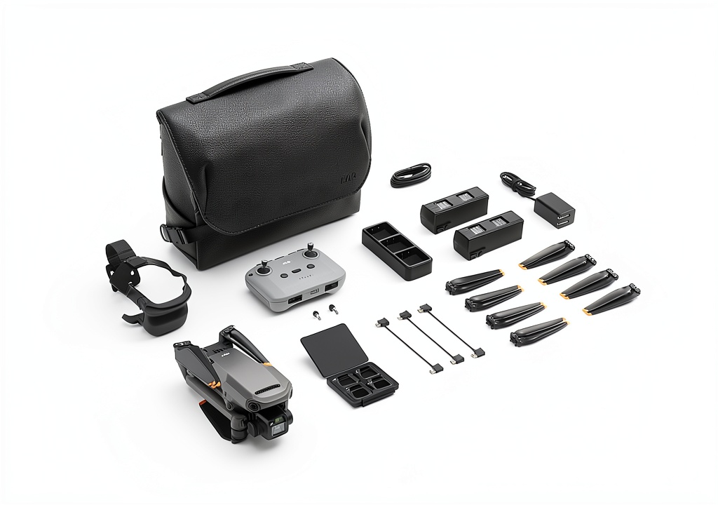 The combo includes the DJI Mavic 3 drone, DJI RC-N1 remote controller, three intelligent flight batteries, low-noise propellers, a battery charging hub, a 65W portable charger, ND filters set, a convertible carrying bag, and various cables for comprehensive use.
