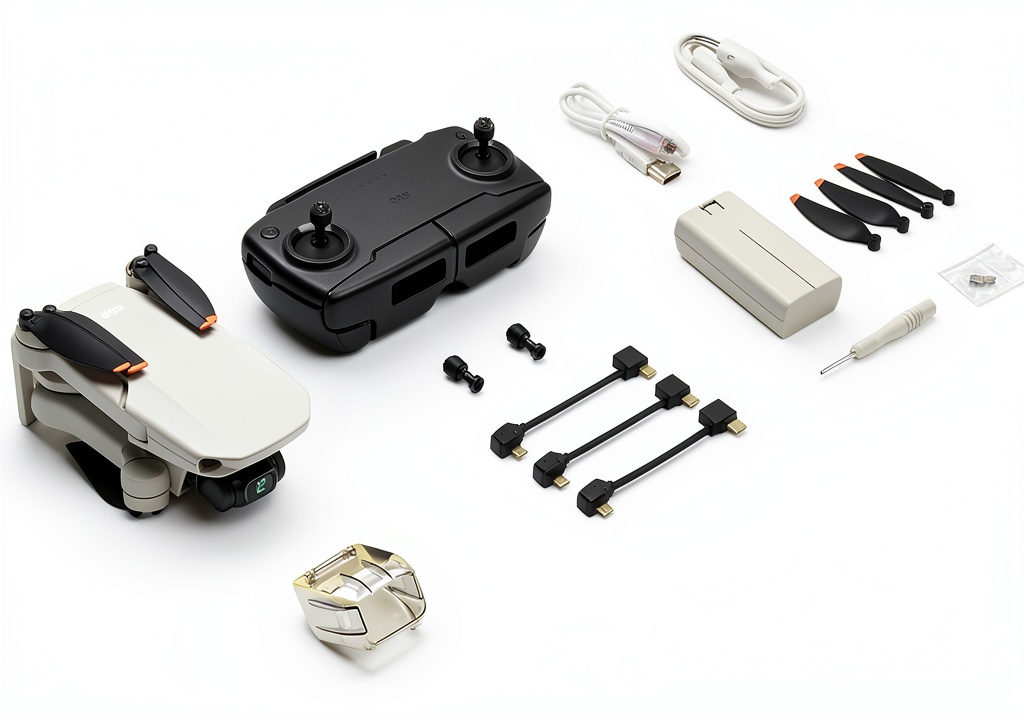 The package contains the DJI Mini SE aircraft, remote controller, intelligent flight battery, spare propellers, gimbal protector, various cables, and control sticks, providing everything needed to start flying immediately.