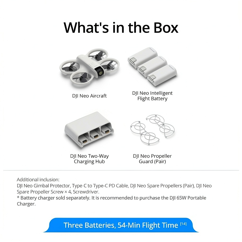 The DJI Neo is a compact mini drone weighing only 135g, designed for easy portability and intuitive use. It features a 4K camera for high-resolution video and photo capture, along with full-coverage propeller guards for enhanced safety. The drone supports palm takeoff, allowing it to launch directly from your hand and automatically record footage. This bundle includes three batteries for extended flight time and an extended warranty kit, providing comprehensive coverage and reliability for users.