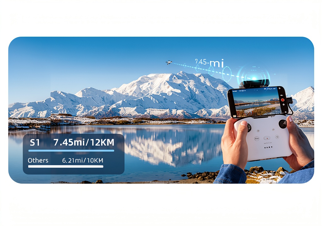 The drone offers up to 39,000 ft (7.45 miles) of 1080P/60fps live video transmission using dual-band 2.4GHz and 5.8GHz for stable connectivity.