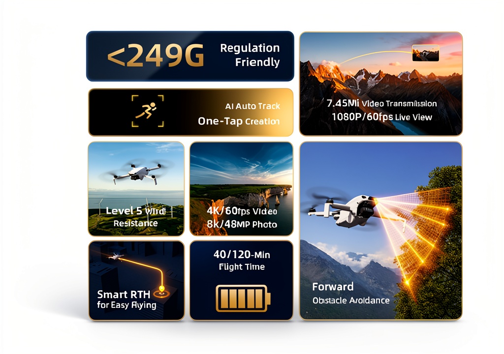 This drone is ideal for travel enthusiasts, vloggers, and families looking to document adventures with cinematic quality. It operates in temperatures from -15° to 40°C and at altitudes up to 5000m, suitable for diverse environments like beaches, mountains, and urban settings. Beginners will appreciate the one-tap takeoff/landing and Smart Return-to-Home features, while automated modes like AI tracking and vertical shooting simplify social media content creation.